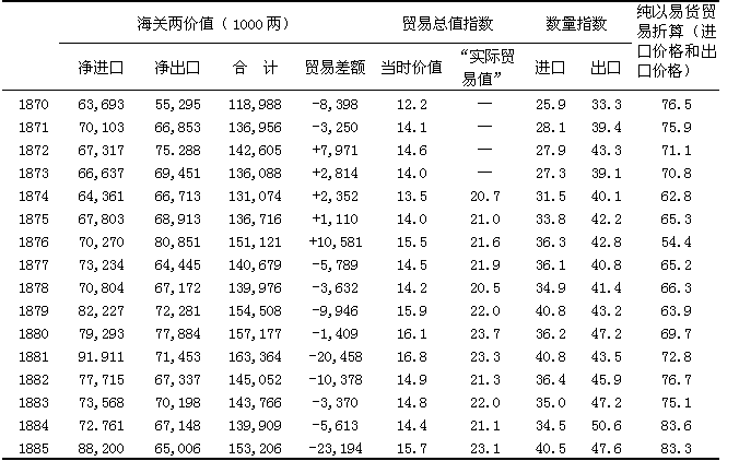 到1911年清朝灭亡时,商业制度表面上起了一个微小但值得注意的变化。虽然我仍将坚持说商业制度基本上保持原样,但人们毕竟普遍认识到了它受到不断开辟的通商口岸和扩大的对外贸易的影响这一事实。在外国人管理下的海关编制的贸易数据几乎是近代中国的唯一有内容的长期历史统计资料。但是即使这些一般说来是非常好的资料也是有缺点的。到1887年为止,没有包括从香港进口的数字,也没有使用离岸价格和成本、保险、运费等数字,因此出口值估计偏低,而进口值则估计偏高。另外,贸易一直以海关银两计算,而当时白银折成黄金的价值一直在下跌,结果贸易的记帐价值如与其黄金价值或其实际数量比较则被夸大了。表十六列出了1870—1911年期间中国对外贸易的价值(以当时的海关两为单位)和指数。
